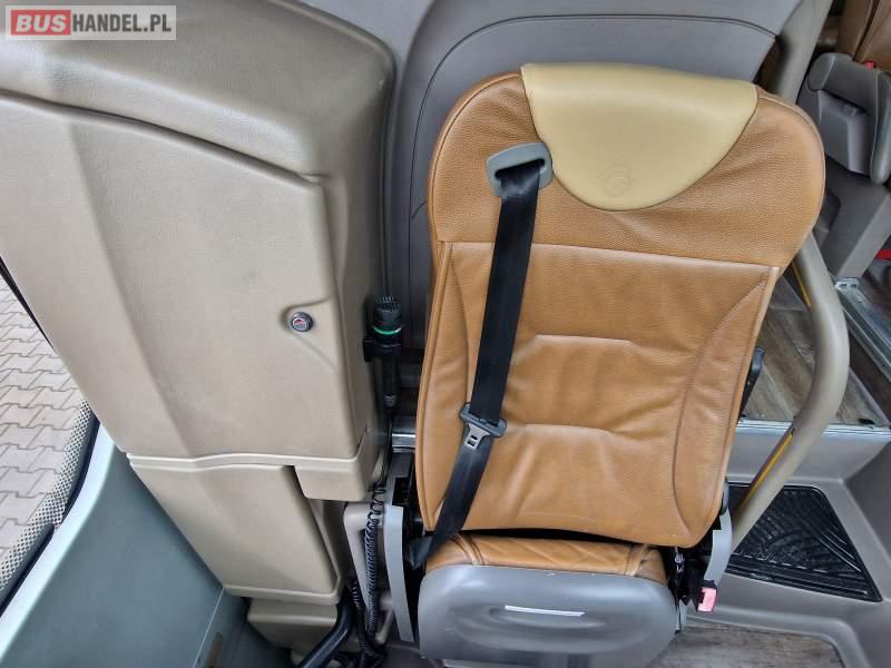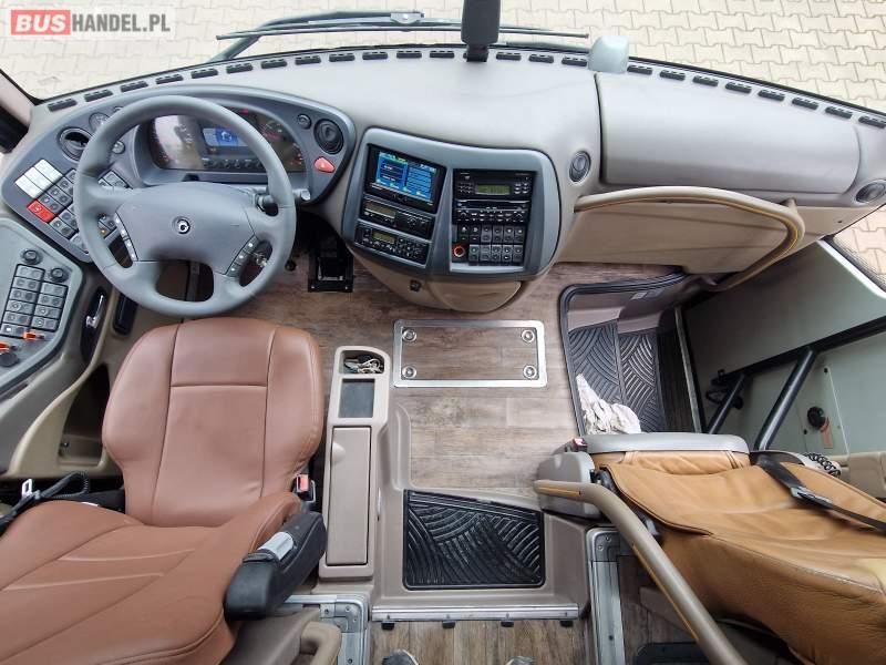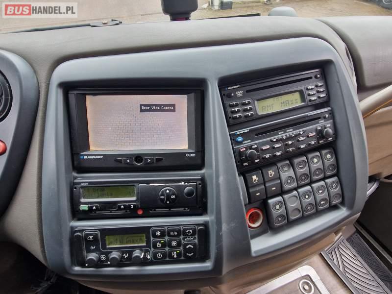 Wyposażenie: klimatyzacja, WC, lodówka, caffebar, oświetlenie indywidualne, fotele odchylane, podnóżki, ABS, ASR, retarder, nawigacja, CD, mikrofon, radio, regulacja wysokości nadwozia, centralny zamek, podwójne szyby boczne, aluminiowe felgi, elektryczne lusterka, ogrzewanie stacjonarne, DVD, ESP